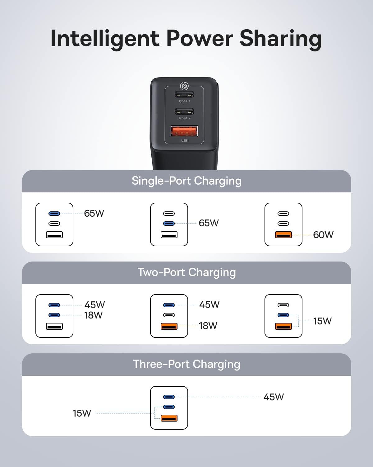 - Carga 3 dispositivos simultáneamente: el cargador Baseus de 65 W GaN tipo C-1 logra una salida máxima de 65 W, cargando dispositivos USB-C a la más alta velocidad. La potencia de carga compartida de dos puertos puede alcanzar 63 W proporcionando la mejor carga para dispositivos móviles.